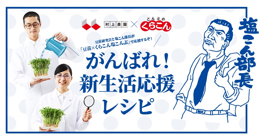 株式会社村上農園(本社:広島市、代表取締役社長:村上清貴)は、新生活をスタートする料理初心者におすすめの豆苗とくらこん塩こんぶを使ったレシピを,、株式会社くらこんと共同で開発し、2019年4月1日から特設ページ(http://www.murakamifarm.com/myouken/shinseikatsu/)にて紹介します。